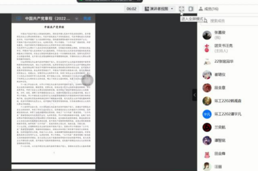 化学2101班,环科2001班,环工2203班团支书带领全班同学温故了由过去五年的工作和新时代十年的伟大变革,到开辟马克思主义中国化时代化新境界,由实施科教兴国战略强化现代化人才支撑,发展全过程人民民主,到保障人民当家作主的战略。环工2202班团支书带领同学们学习共产党章程,经过又一轮的学习,同学们对新时代中国特色社会主义、党的二十大精神有了更深刻的理解与感悟。研环境2258班团支书还开展了有奖知识竞答、你来做我来猜等活动调动了同学们的积极性。最后在大家合唱团歌后结束团日活动。