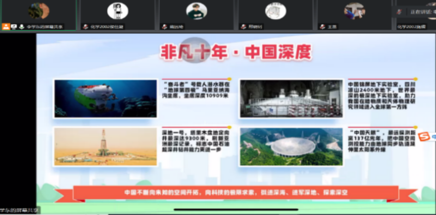 以“学习党的二十大报告精神,要践行其本质要求”为题入手,环工2201班,化学2002班,化学2102班的团支书对十年中国取得的成就进行介绍,包括中国高度、中国速度、中国跨度等。强调如今情况下同学们应自觉做新时代信仰坚定的拥护者,积极开展个人自学,总结经验、关照现实、落实生活。全体同学积极热情,参与度高,深刻认识到作为新时代青年,必须要在时代新起点下,努力学习科学文化知识,加强各项技能训练,在学习、实践中展现青年学子的担当作为、施展抱负才华,不负青春、不负使命。