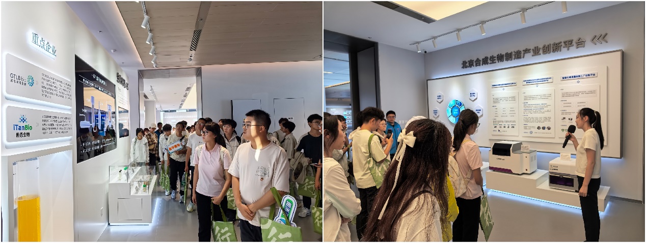 在合成生物制造产业发展展示中心,同学们完成了一次从原理认知到产业展望的深度探索。合成生物学的技术图谱与产业脉络不再是书本上抽象的概念,而是化身为眼前生动的模型与演示,清晰勾勒出从实验室通向产业的完整路径。大家细致了解了北京市在这一战略性新兴领域的宏大布局与坚实步伐,特别是北京合成生物制造技术创新中心所肩负的攻坚使命与清晰规划。而当目光转向企业产品展区,生物医药、美丽健康、绿色能源与现代农业等领域的百余项创新成果纷至沓来,令人应接不暇。这些实实在在的产品,无声却有力地诉说着合成生物技术如何以前所未有的方式驱动着一场深刻的绿色革命。