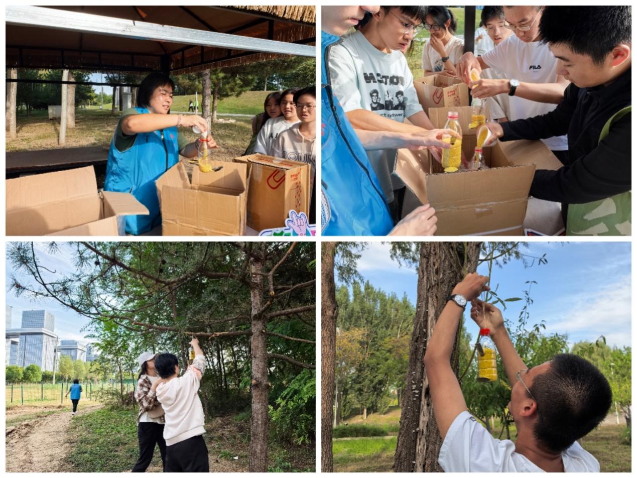 带着从展厅收获的震撼与启示,同学们旋即投身于滨水公园的自然怀抱,在实践中回应科技的绿色召唤。在志愿者们的巧妙指引下,一个个被闲置的塑料瓶与铁勺,经过同学们的精心剪裁与组装,焕然成为点缀在枝头间的简易喂鸟器。这不仅是一次“变废为宝”的巧思实践,更是为公园生灵送去的一份份温暖关怀。随后,大家沿着秋意浓郁的公园步道徐徐前行,不仅用眼睛收藏层林尽染的诗意,更用双手践行着环境学子的担当——同学们俯身拾起散落的垃圾,以最直接的行动守护着这片美景的洁净与和谐。