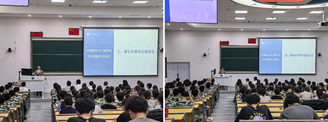 新生代表环科2501班宋沂铭同学结合观看“中国人民抗日战争暨世界反法西斯战争胜利80周年纪念大会”的感悟,畅谈自己对“能源报国”理想的认识。她号召新时代环境学子树立“能源报国”远大志向,聚焦国家“双碳”目标,勤于学习、善于思考,为建设美丽中国贡献青春力量。教师代表碳储科学与工程教研室李雨宸老师从自身经验出发,分享了自己在华电校园如何从一名本科生逐渐成长为一名专职教师的宝贵经历,李老师鼓励新生要发挥主观能动性,要善于利用学校提供的各类资源,积极参与实践活动与科研项目,不断提升自己的专业素养和综合能力。