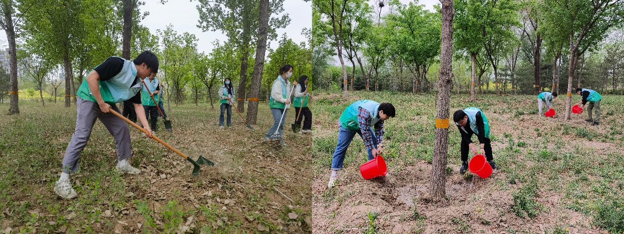 根据植树基地的实际需要,本次尽责活动主要进行绿地除杂与浇水工作。参与成员们首先进入绿地进行除杂,用铁锹铲除杂苗、用钉耙清运杂草,大家分工明确,密切配合,井然有序;随后成员们又对园区的树苗进行了浇灌,通过对树苗的抚育来巩固造林成效。经过成员们的共同努力,本次活动共清理绿地150余平方米,抚育树木30余棵,为昌平区增绿造林、建设花园城市贡献了力量,党员们认真工作、护绿增绿的热情与态度也获得了植树基地工作人员的认可和夸奖。“增绿就是增优势,植树就是植未来。”参与活动的同学纷纷表示:植树造林功在当代、利在千秋,作为环境人,更应该用实际行动做习近平生态文明思想的践行者与传播者,一茬接着一茬种,一代接着一代干,不断增厚我们的“绿色家底”,为建设美丽中国贡献力量。