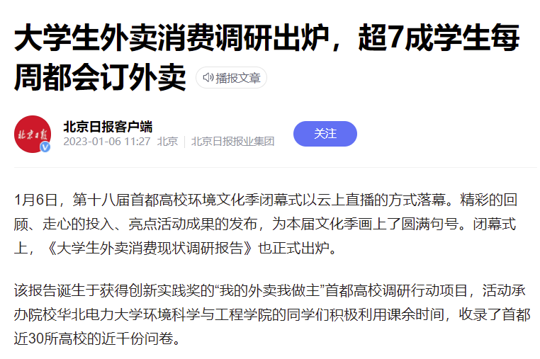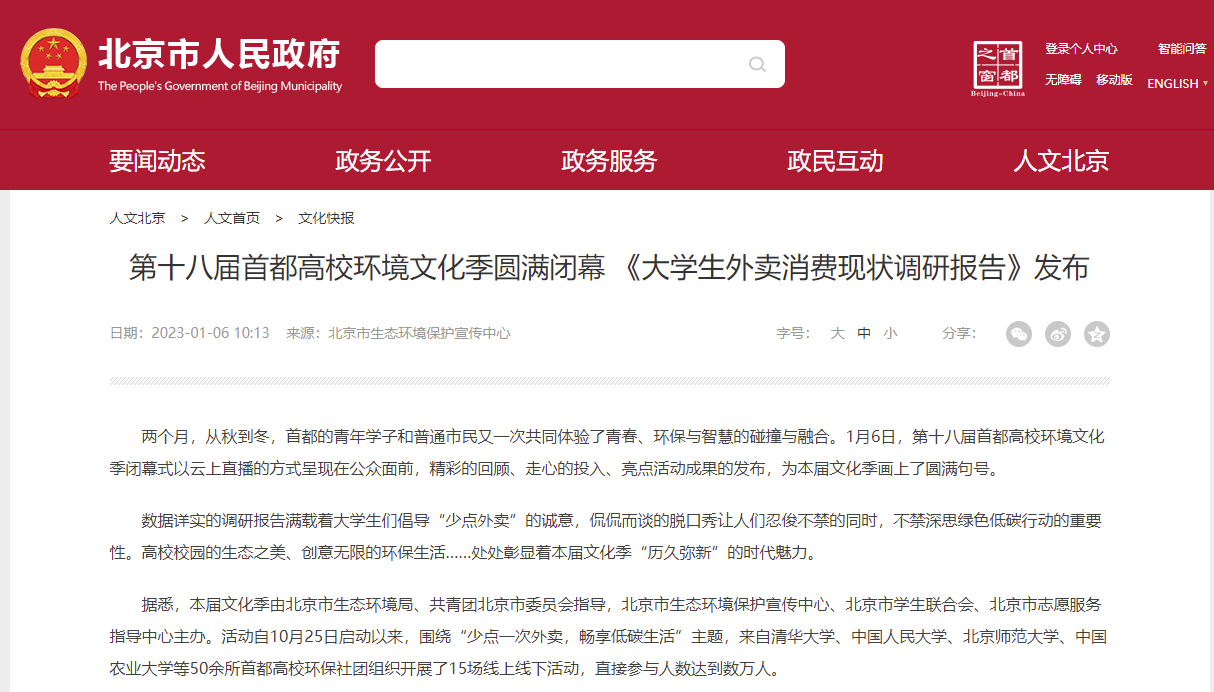 1月6日,由北京市生态环境局、共青团北京市委员会指导,北京市生态环境保护宣传中心、北京市学生联合会、北京市志愿服务指导中心主办的第十八届首都高校环境文化季闭幕式在线上举行,jdb电子中国官方网站承办的“我的外卖我做主”首都高校调研行动项目荣获创新实践奖,受到北京市人民政府、北京日报、中国日报网、北京青年报等多家主流媒体广泛关注报道。
